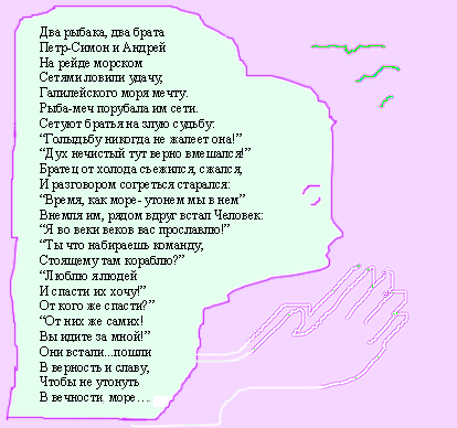 Всё бы хорошо, но Пётр и Андрей ловили рыбу на озере Кинерет (Генисаретское), которое образно, как самый большой водоём в Галилее называлось Море Галилейское, но это пресный водоём, в котором НИКОГДА не водилась рыба-меч и НЕ плавали КОРАБЛИ см. Евангелия. с уважением к таланту. Комментарий автора: Поверьте, Влад, что я не нарочно